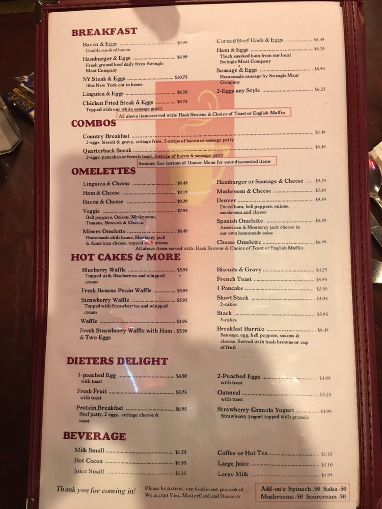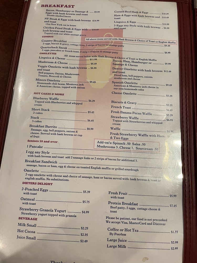 Choice of bacon or sausage. Onions, bell peppers, cheese, eggs and hashbrowns.