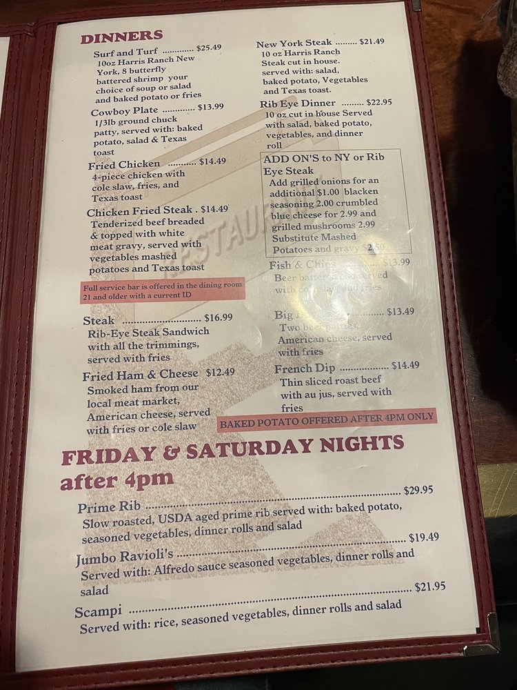 FRIDAY & SATURDAY Slow roasted, USDA aged prime rib served with: baked potato, seasoned vegetables, dinner rolls and salad.
